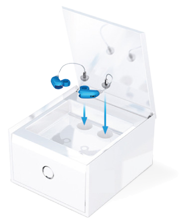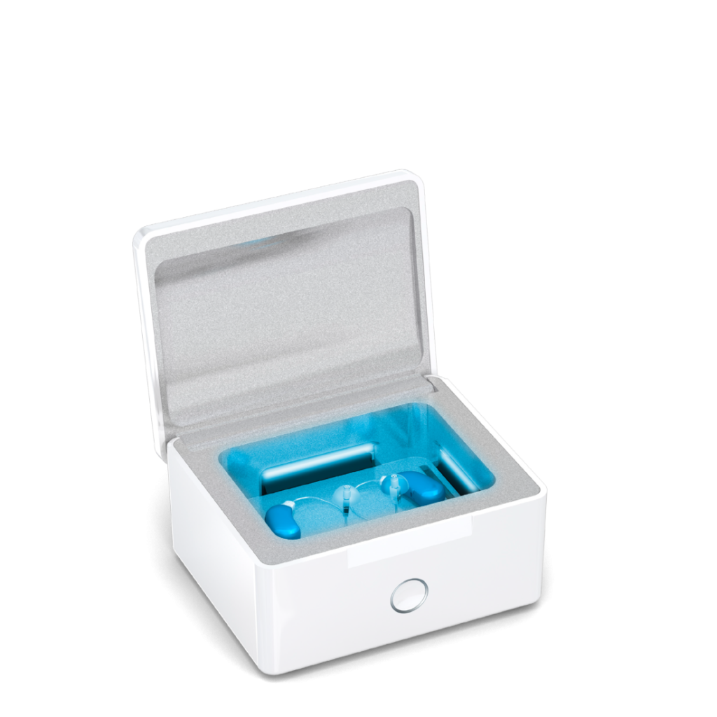 • Rayons UV-C générés par une lampe à longueur d’onde courte à 360° pour atteindre l’ensemble des surfaces de vos appareils auditifs