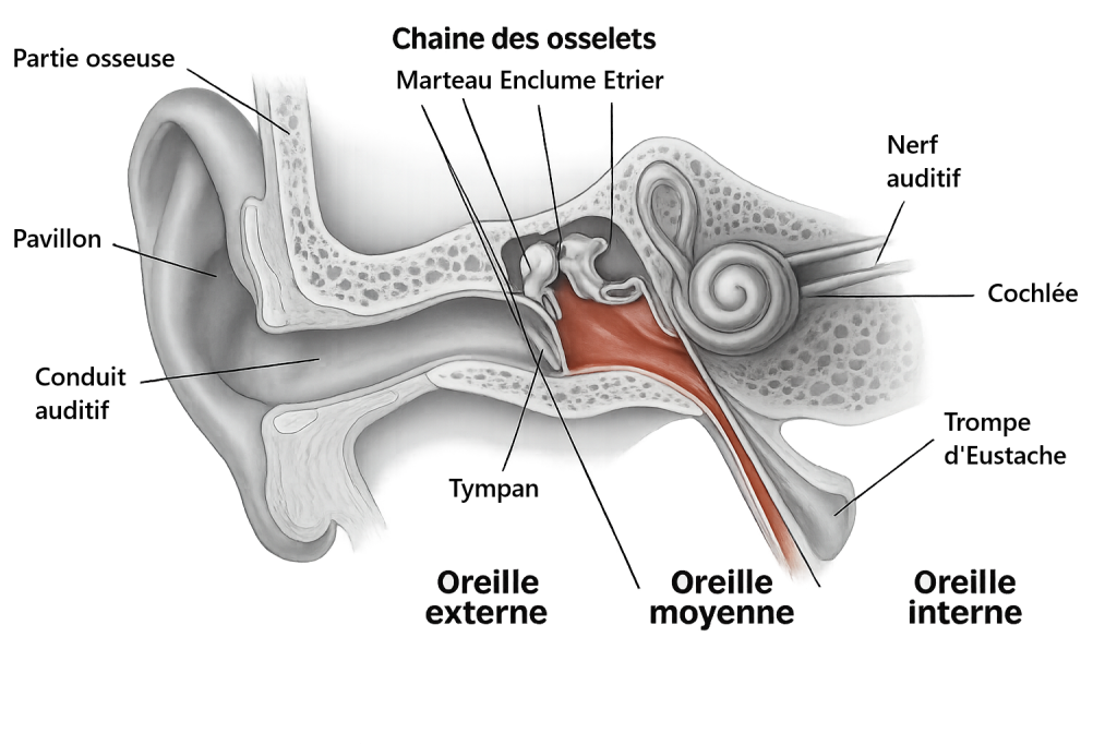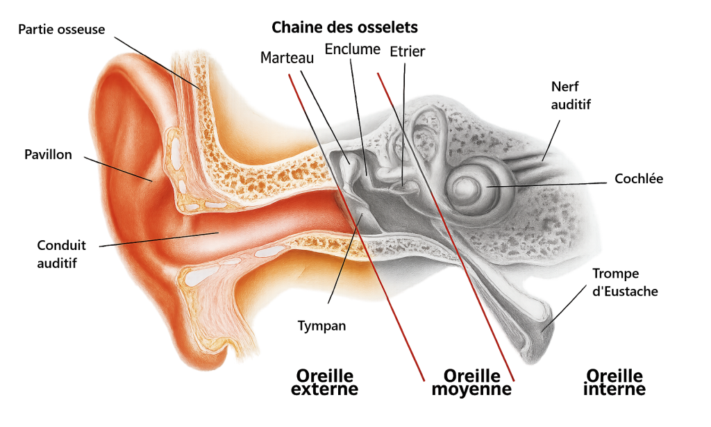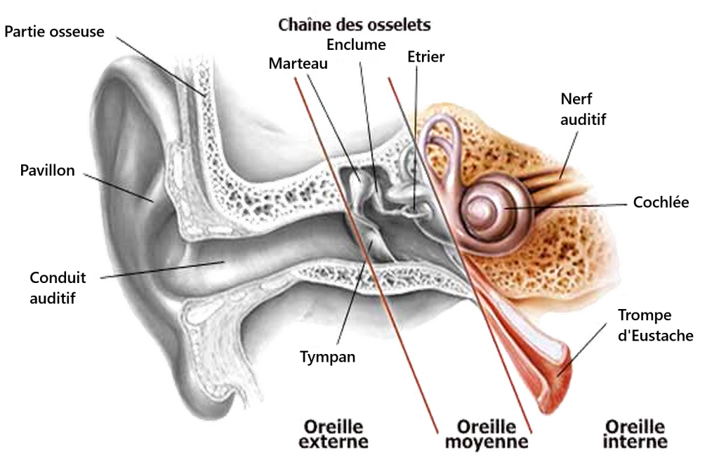 - La perte auditive neurosensorielle, qui est une atteinte de l’oreille interne elle-même (ex : traumatisme sonore, surdité génétique, presbyacousie,etc.)